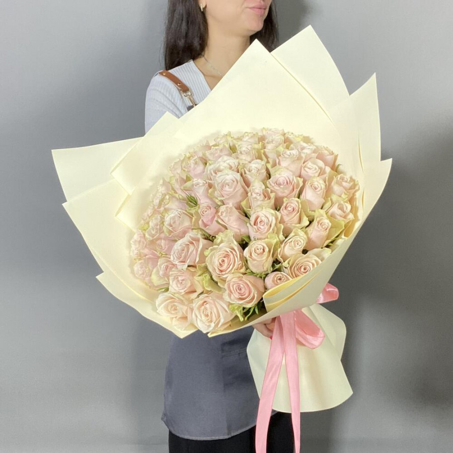 На фото букет из 51 кремовой розы. В составе: роза 51 шт, фоамиран 2 шт, атласная лента 1 шт, . Все цветы свежие и ароматные, букет красиво оформлен и отлично подходит для подарка. Доступна доставка цветов или самовывоз.