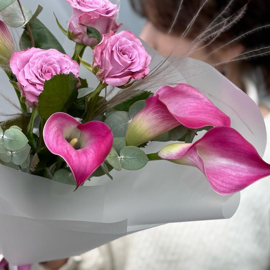 На фото букет «розовый восторг». В составе: калла 4 шт, роза 3 шт, зелень 2 шт, эвкалипт 1 шт, дизайнерская упаковка 1 шт, атласная лента 1 шт, . Все цветы свежие и ароматные, букет красиво оформлен и отлично подходит для подарка. Доступна доставка цветов или самовывоз.